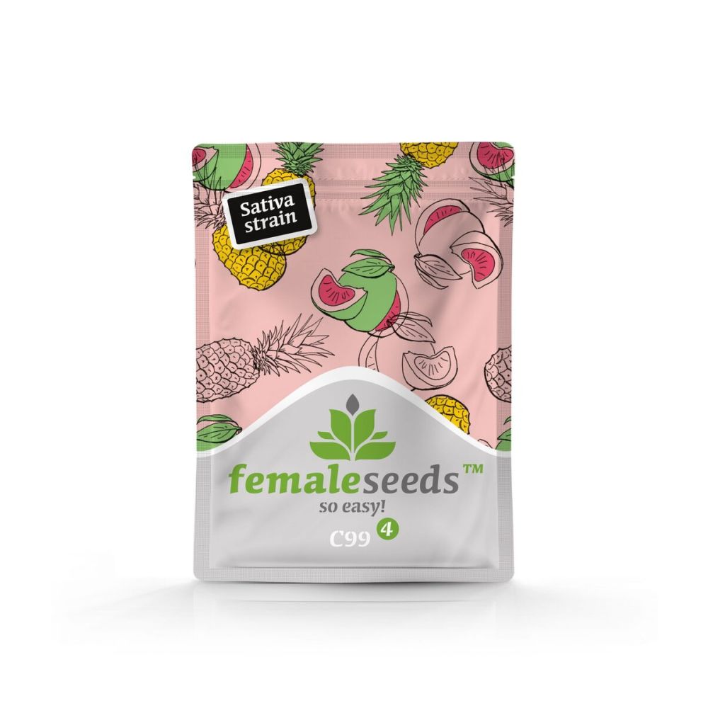 C99 von Female Seeds kombiniert süße Ananas- und Grapefruitaromen mit einem langanhaltenden, kreativen High. Mit bis zu 24 % THC und schneller Blüte ist sie ideal für anspruchsvolle Grower.